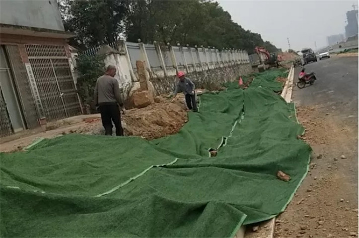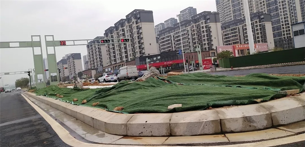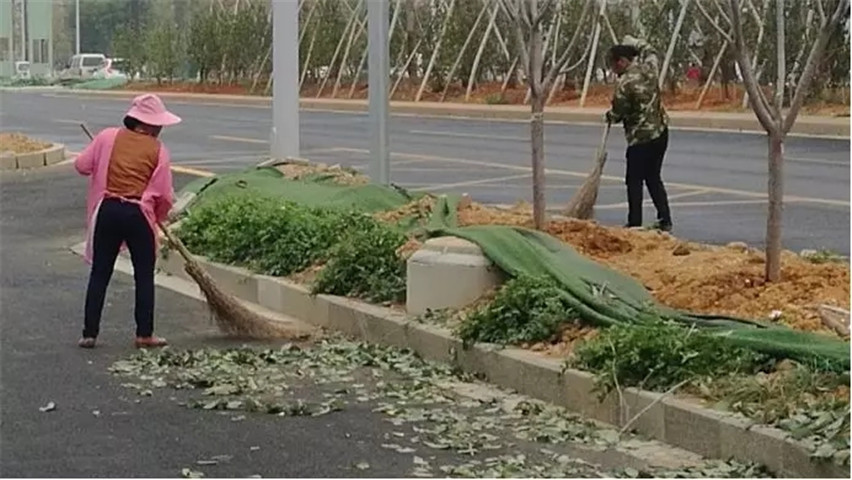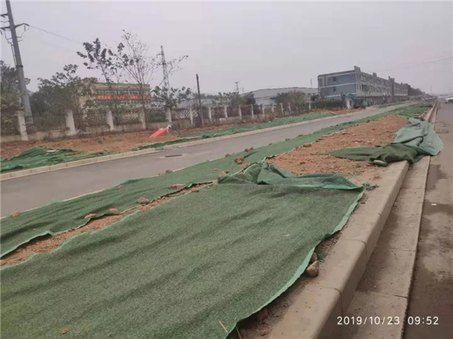 开启雾炮机降尘,组织工人清洗道路和种草区域人工洒水,补草种